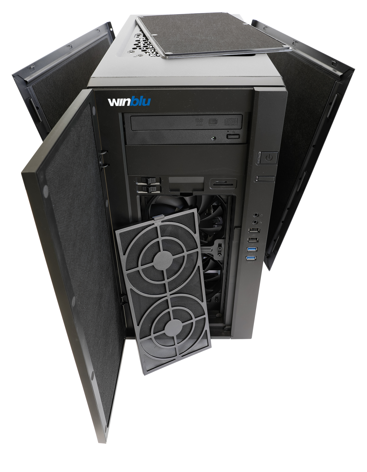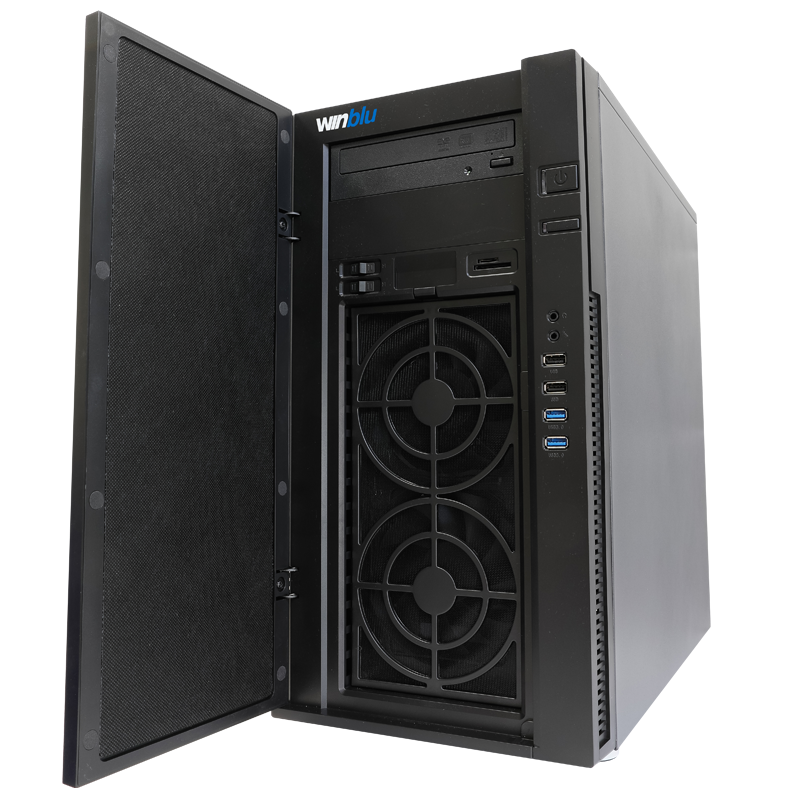 Mid-tower colore nero, Alimentatori 750W/850W/1000W 80Plus Bronze/Gold (specifiche in base al modello scelto), Dimensioni (PxLxA) 475x230x455mm, n°2 ventole di raffreddamento 120mm frontali con switch di controllo della velocità, Pannelli fonoassorbenti per il massimo della silenziosità, Filtri antipolvere estraibili per un’ottimale pulizia e manutenzione